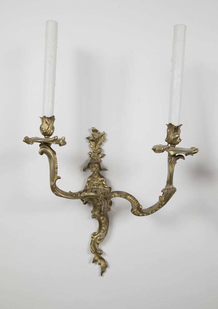 A pair of Louis XV style 2-light bronze dore sconces each with a back plate cast as chinoiserie figures, open foliate voluted branches, candle holders and bobeches. These French wall sconces have been newly electrified.
