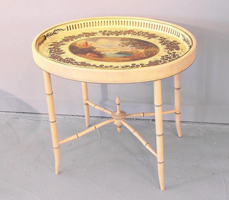George IV painted oval tole tray with neoclassic scene, mounted on a color-matched custom faux bamboo base with finial - English
