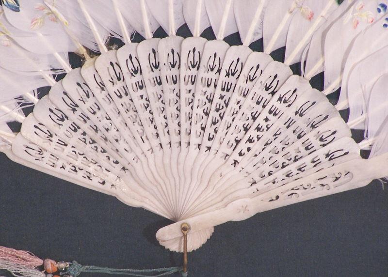A good China trade hand-painted peacock feather fan depicting Mandarin Courtesans amid floral decoration, the pierced bone spokes collected by a brass handle w/original silk tassels; in a custom silvered frame. Canton, China