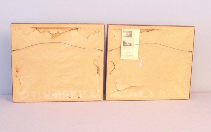 A pair of China Trade oil paintings on board of junks at sea with figures, custom mounted over silk damask, in faux cinnabar red lacquered frames, under glass. Canton.