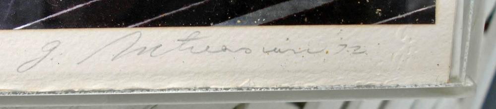 A classic 70's Mid-Century Modern lithograph by Garo Zarel Antreasian (b 1922), pencil signed & dated '72 (lower right) & numbered 15/15 (lower left), the multi-color vertical composition divided by foil striping from top to bottom; original gallery acrylic framing, partially labeled verso: Malvina Miller Gallery, San Francisco, CA. Dated 1972. Studied: Art Student's League, NYC. Collections include; Museum of Fine Arts, Boston, Brooklyn Museum, MOMA, Museum of Modern Art, Corcoran Gallery, etc. References: Who Was Who in American Art, Davenport's, Ask Art, etc.