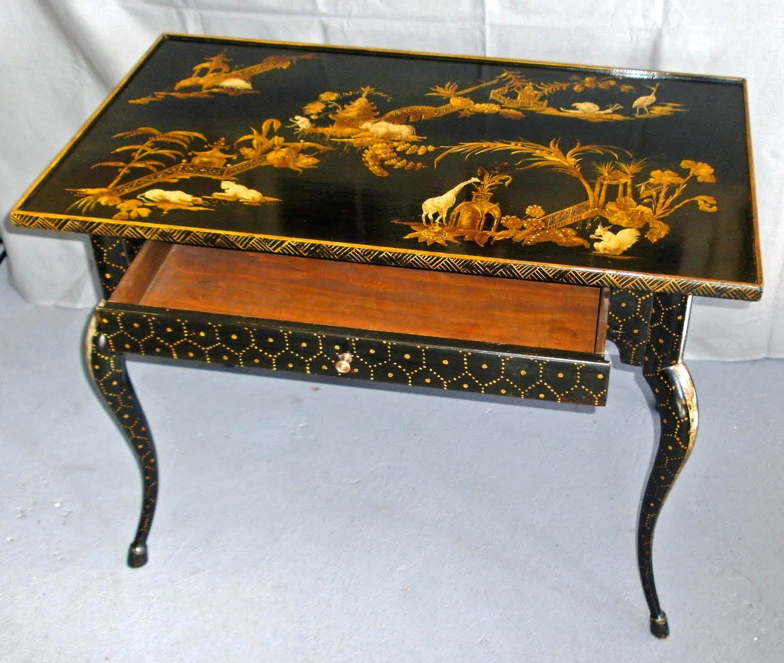 A stunning Jansen School black lacquered chinoiserie decorated occasional table in the Louis XIII style, the oblong tray top gilt painted with assorted animals, including giraffes, parrots etc. in a classic Cantonese garden setting, having a single full facia drawer w/brass pull, on exaggerated cabriole legs ending in stylized hoof feet. Size: 27.13"d x 35.75"w x 20.25"h, Circa 1920