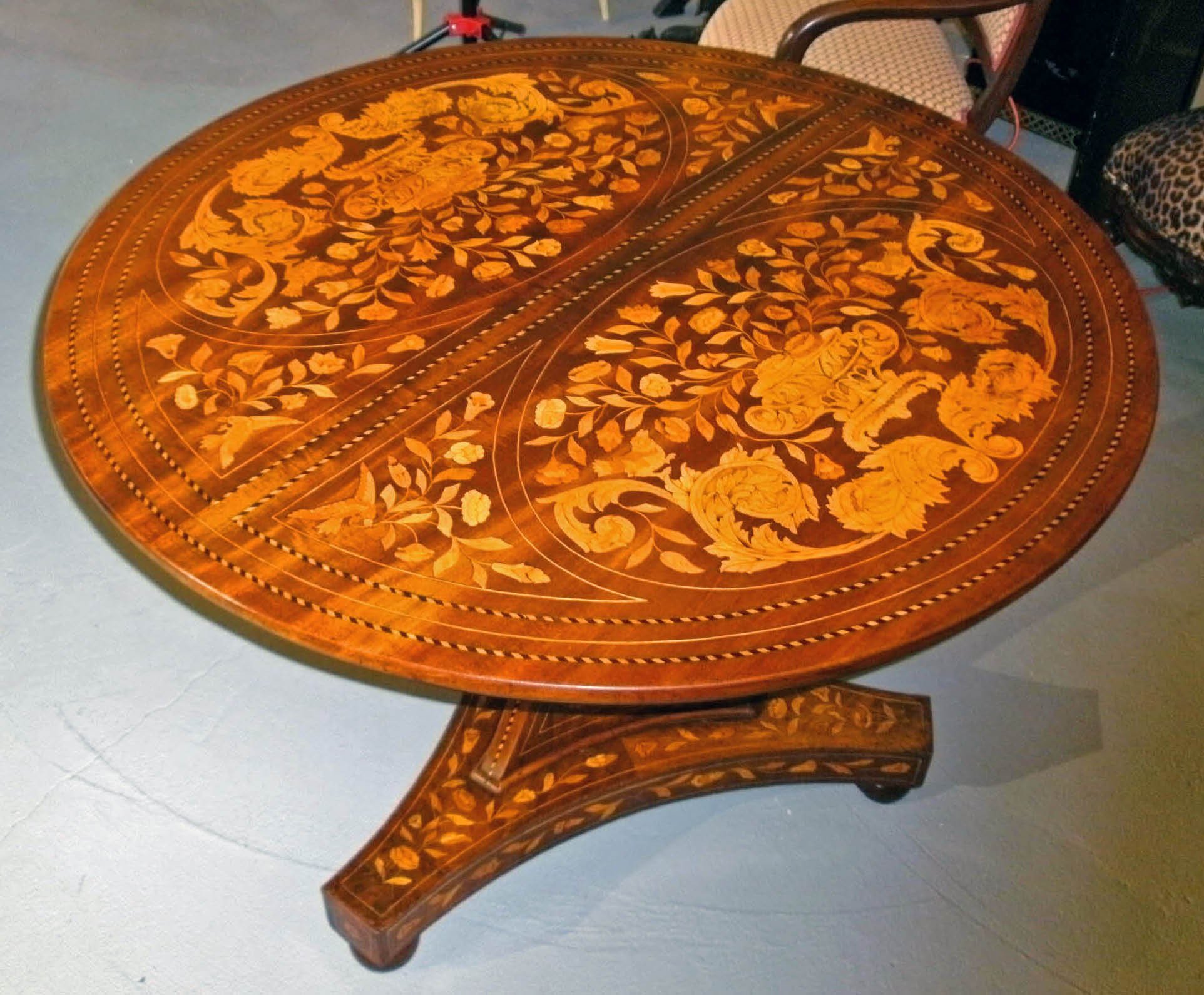 Dutch baroque style walnut and fruitwood marquetry center table on a tripod, footed base, the top, apron and base inlaid with elaborate 18th Century style floral design, including birds. Circa 1840.� �Dimensions: 30" H x 42 1/4" diameter.