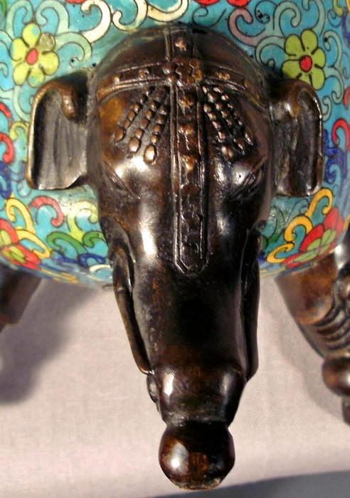 Chinese Cloisonne Incense Burner. Â A Chinese cloisonne enameled archaic-form incense burner, the bulbous-shaped bronze vessel having a removable, reticulated dome-shape cover topped by a bronze dragon-form finial, supported by 3 elephant head feet, including embossed carry handles. 6 Character Mark, verso. Qing Dynasty. Overall dimensions: 6" W x 14" H