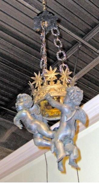 An unusual Empire style hallway chandelier; 3 patinated cast bronze putti supporting a gilt metal coronet, suspended from 3 gilt brass chains, including a decorative ceiling mount, electrified. Continental, probably French, c. 1890--1910.. (Note: chain can be shortened according to ceiling height.) Also ideal for small diningroom. Dimensions: 34" H x 22" dia.