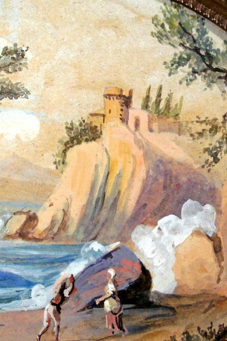 A pair of late 18th c. miniature oval shape gouaches of classic pastoral scenery (ruins, fortress, Roman bridge, etc.) with attending figures in period dress, the bronze ormolu frames (original) with raised egg-and-dart & beaded decoration, one signed by the artist (indistinguishable) lower right.
