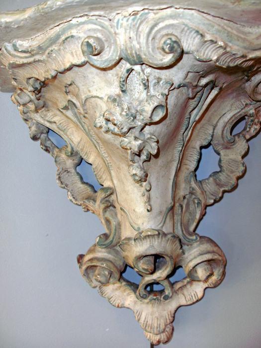 A fine pair of 18th Century Italian Rococo Period hand carved, grey-painted wall brackets w/green tracing, each with a shaped faux marble painted, bevelled shelf, above a triangular shaped, pierced floral & foliate support, centering a floral spray. Circa Data: 1760. Dimensions: 13.75" H x 14.50" W x 8.5" D.