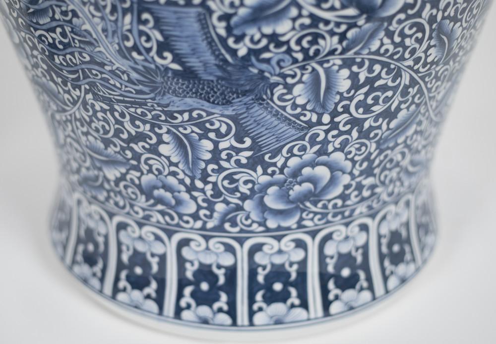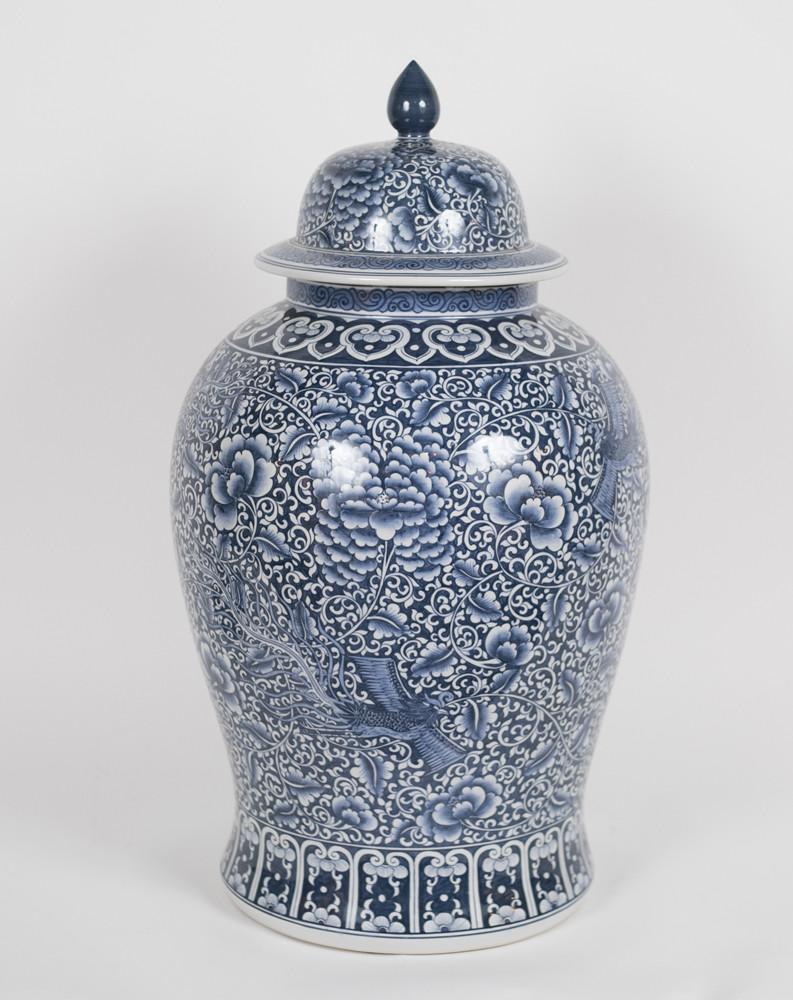 An impressive Cantonese style hand painted blue & white decorated oversize ginger jar with cover.  Thailand. Dimensions: 30" H x 16" diameter.