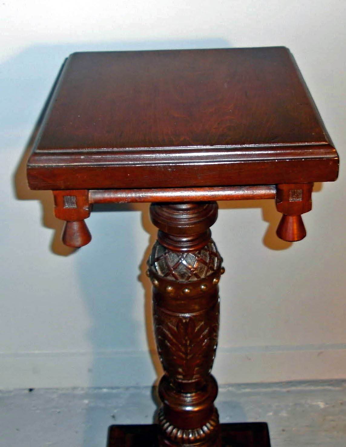 A rare American Aesthetic Period highly carved walnut pedestal, having an applied bell-drop (4) apron with connecting dowel stretchers, over a multi-motif carved, turned column, on a stepped, squared plinth, over bun feet. Probably of Philadelphia origin, c. 1830. Dimensions: 32.5" H x 12" W x 12" D.
