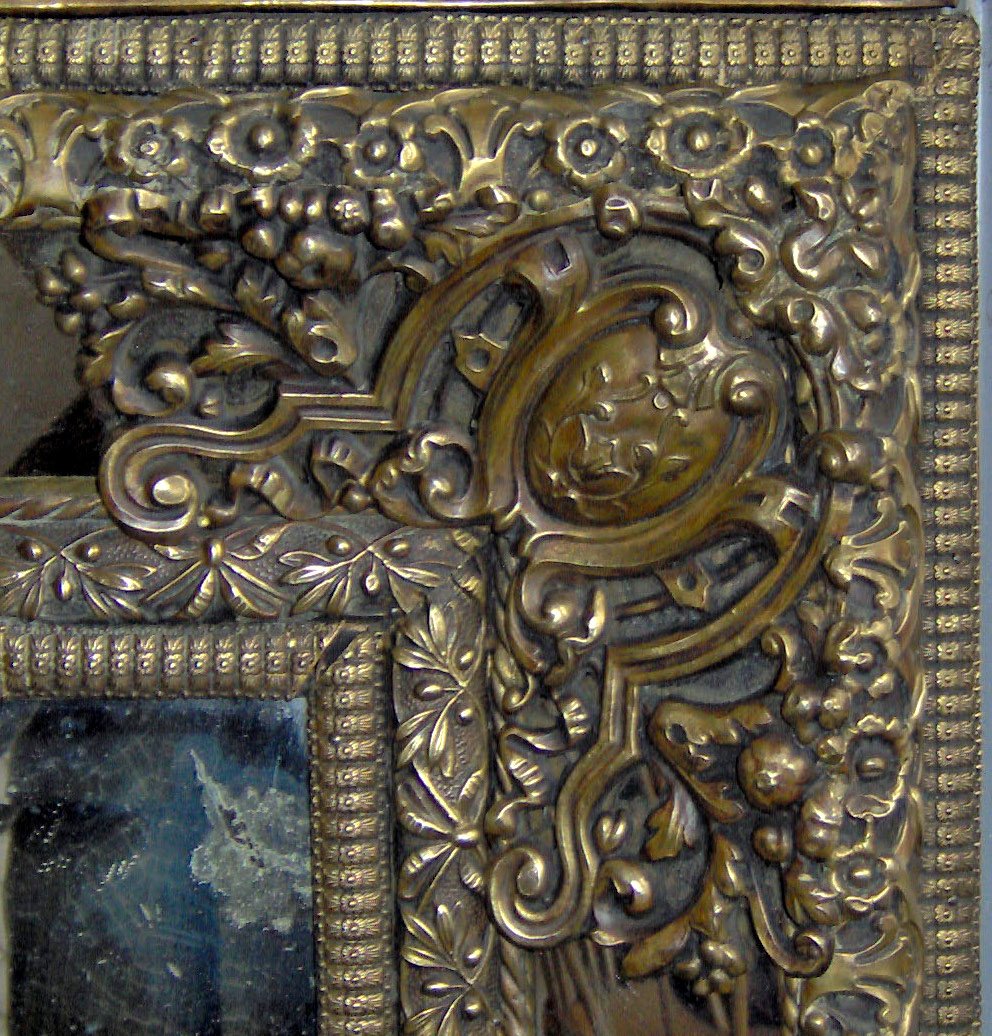 A 19th Century Continental repousse brass paneled mirror with a later antiqued rectangular glass and side panels; overall foliate design in the classic arabesque manner w/detachable crest, displaying a flower & urn motif. Probably of German origin. Circa 1880.  Dimensions: 55" H x 34.35" W.