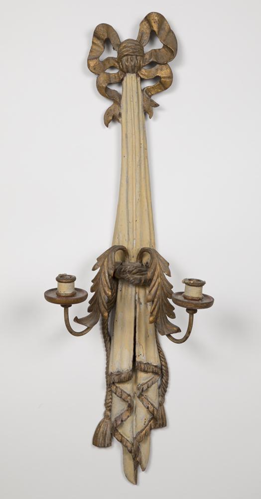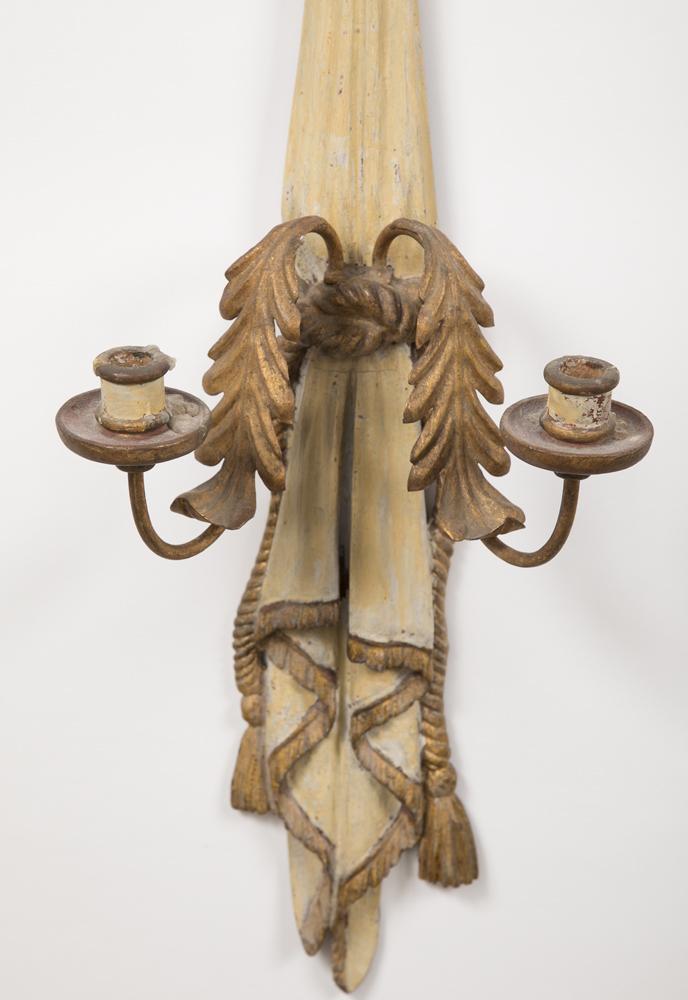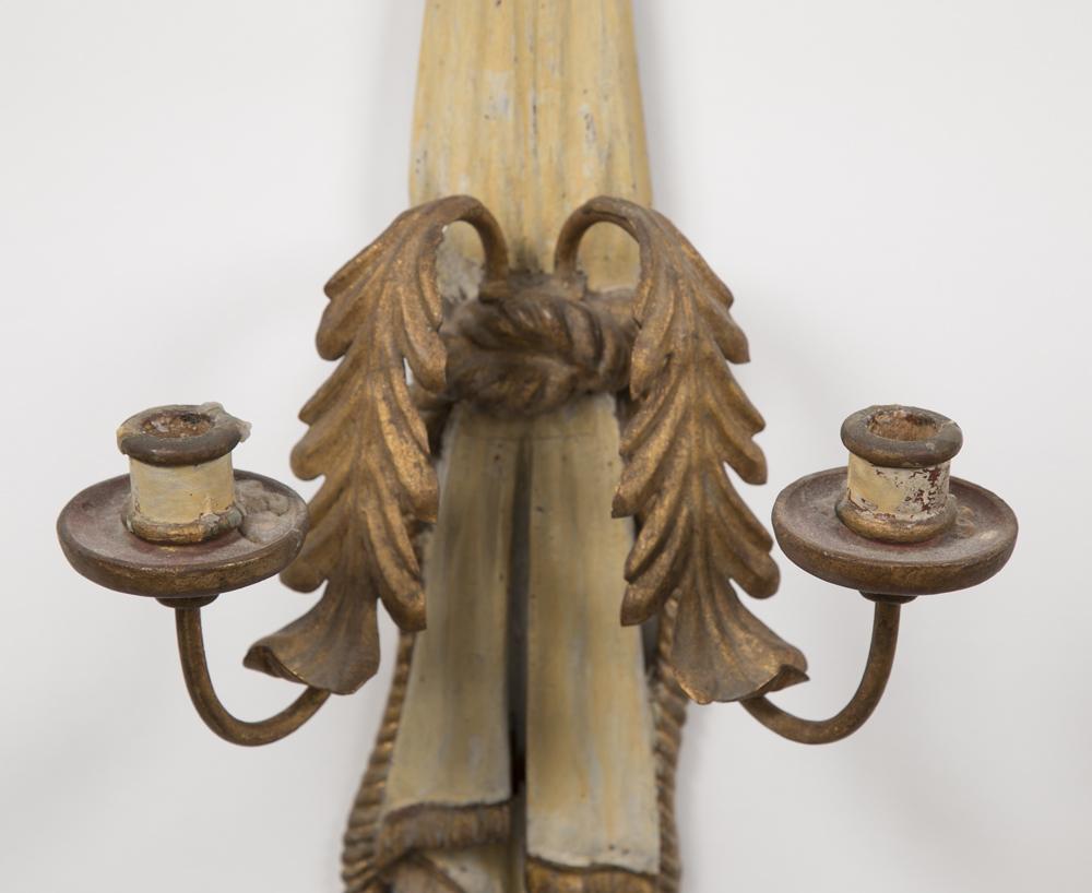 A pair of 19th century Italian hand carved, painted gesso 2 lite wall sconces; the iron & tole candle holders suspended from a large gilt painted bow. Circa 1910. Dimensions: 29.5" H x 8" W.