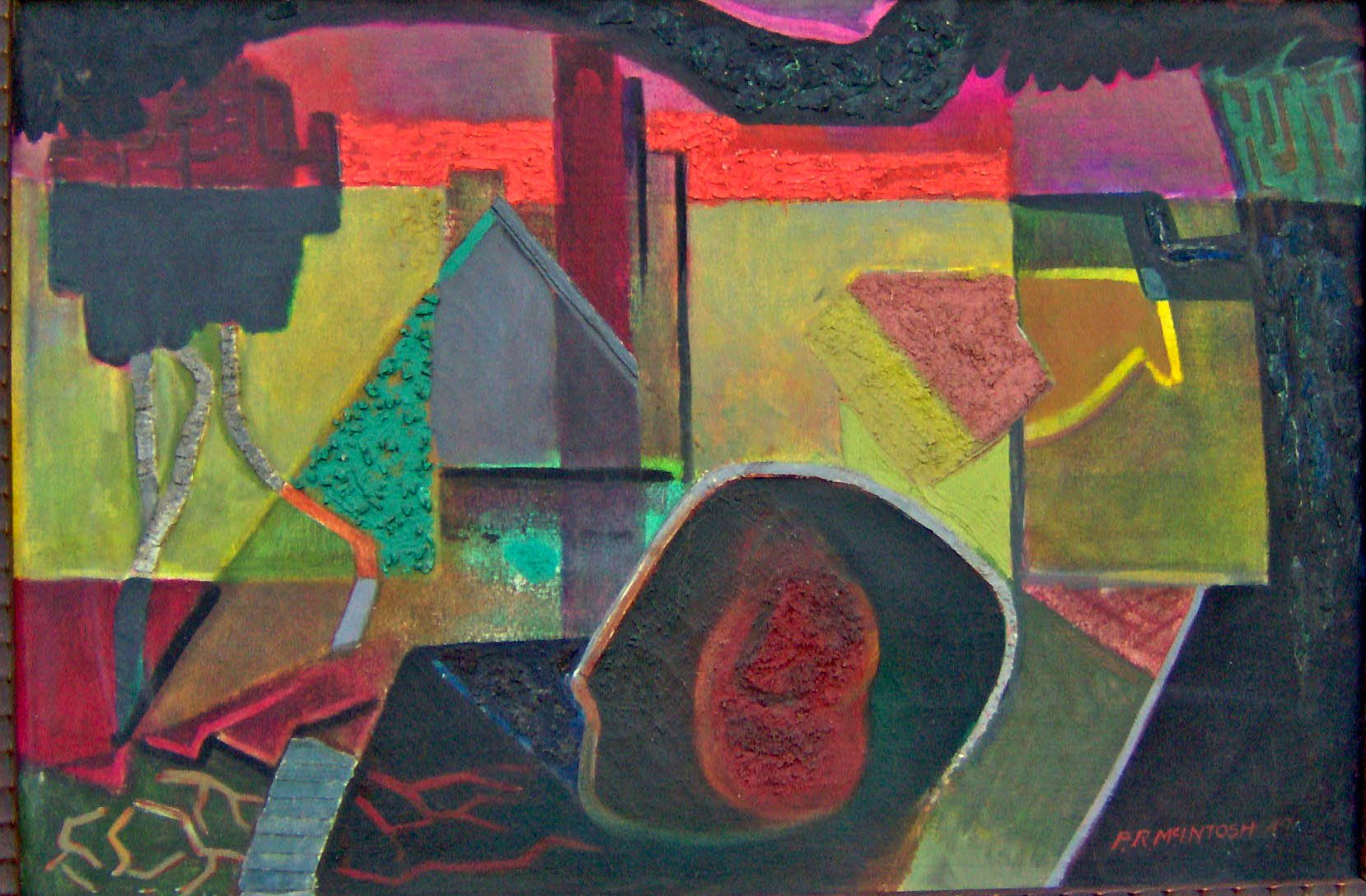 "Evening Abstraction" geometric abstract painting by Pleasant Ray McIntosh ( b. 1897 - d. 1985 ). Signed and dated 1947, lower right. Entitled "Evening Abstraction," verso. Director of Peoria Art Institute, Art School of Bradley University & headed the Art Department of American University, Biarritz, France. Well listed: Who Was Who in American Art, Davenports, Ask, Art. Mid 20th Century. Dimensions. framed: 41" W x 30" H.