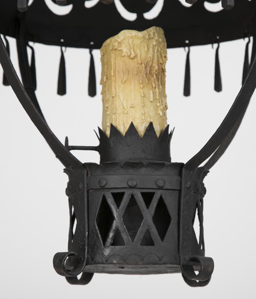 An Arts & Crafts hand wrought iron hanging lantern, the pierced umbrella shaped shade decorated with drop-out Fleurs-de-Lis, having iron drops supported by 4 connecting straps to an oil reservoir fitted as a candle holder, surmounted by a smoke cap with ring holder.  Co-ordinating chain & canopy included. Circa 1930. Dimensions: 30" H x 18" dia.