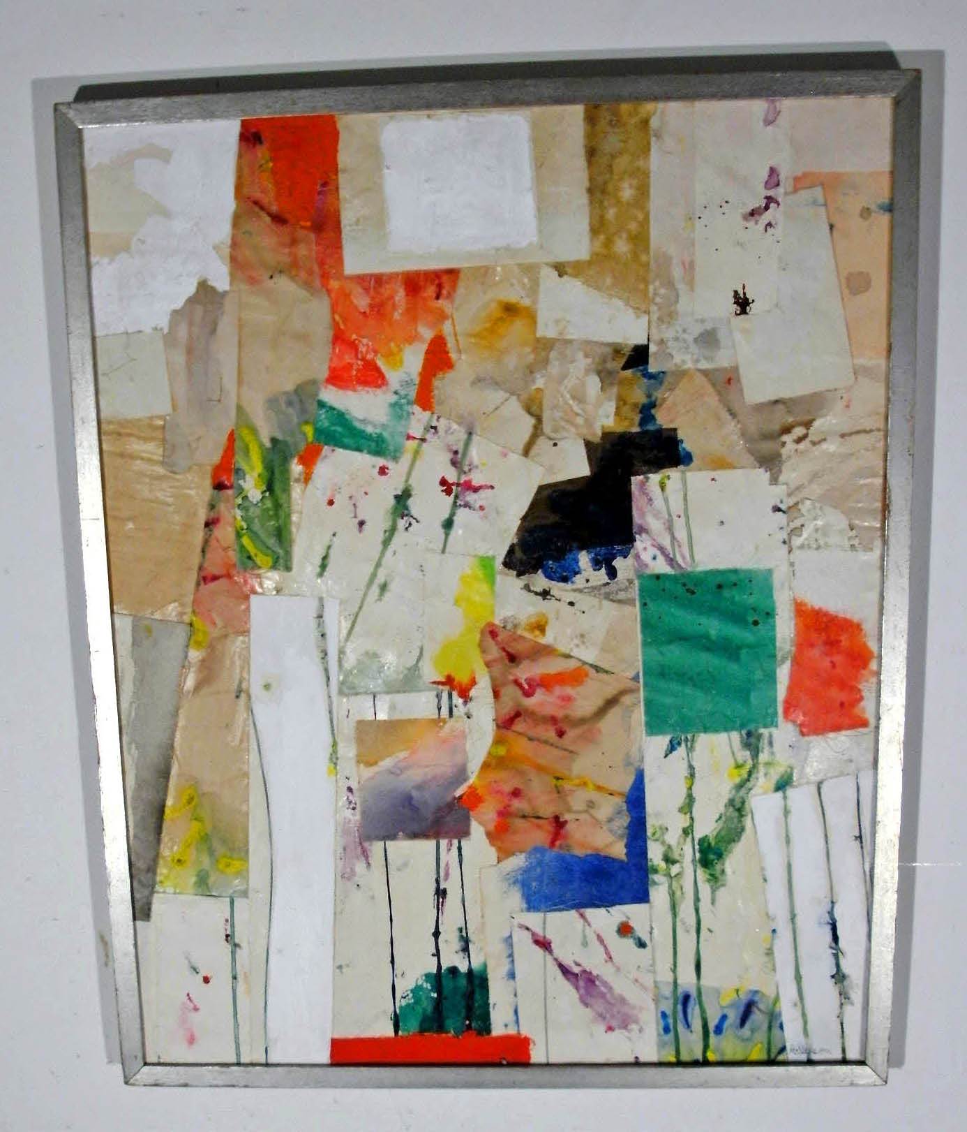 Carl Gustaf Nelson (b.1898---d.1988) abstract expressionist mixed media collage, mid 20th Century; original silver-leafed frame. Mid 20th Century.