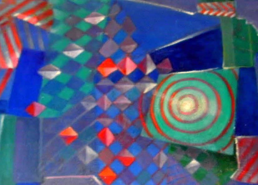 A geometric abstract oil on board by well listed Connecticut and Rhode Island artist Virginia M. Hogan.  Listed in Who Was Who in American Art. Davenport's, Mallet's, Ask Art, etc. Provenance: See sticker (verso) for 1955 South County Art Association, R. I. & estate label per John E. Woodmansee III. Newly custom matted and framed.  Dimensions, framed; 37 1/2"W x 34 1/4" H. Artwork: 23" W x 19" W.