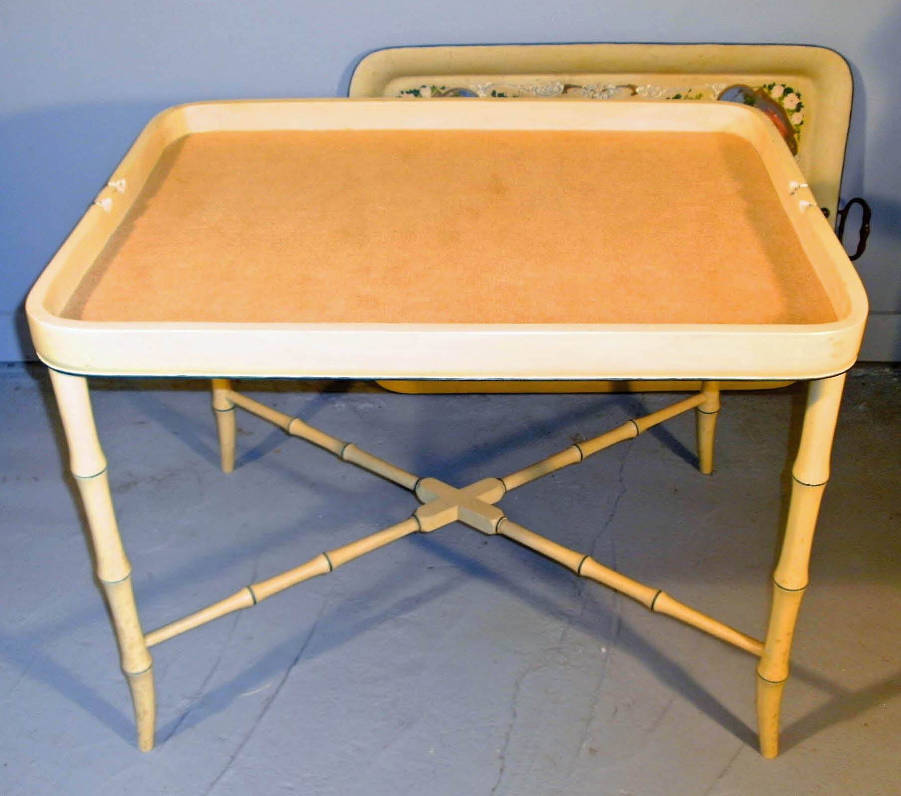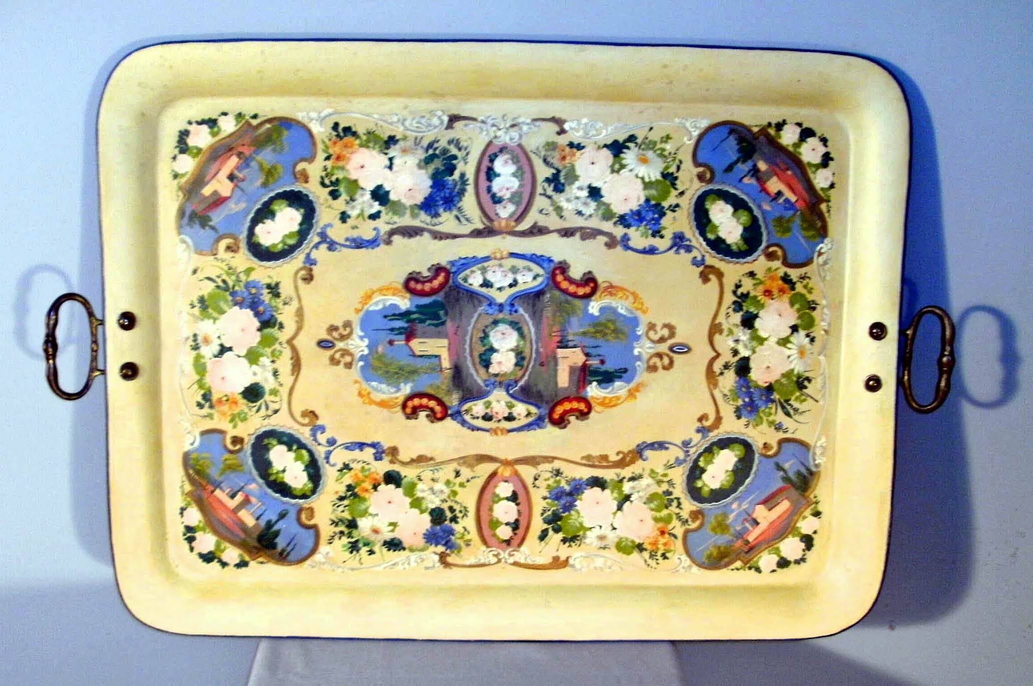 An unusual 19th Century Continental hand painted tole tray with brass handles, depicting an Italian landscape on a cream color background w/floral sprays & neo classic scenery, newly custom mounted as a tray table w/faux bamboo legs and cross stretcher. Tray: c, 1880. Dimensions: 22" H x 32" W x 21 12" D.