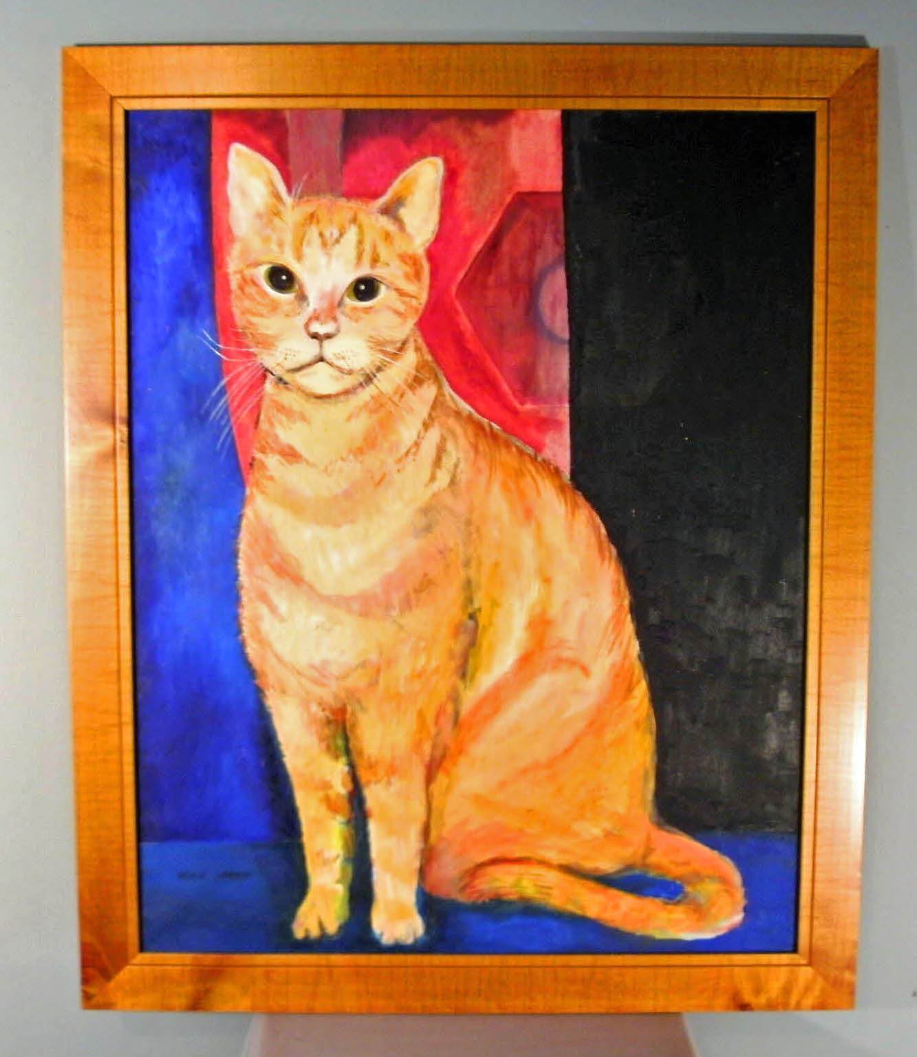 A charming cat portrait by listed Eames Era painter May Janko (b. 1926).  This iconographic abstract oil painting is on canvas, signed & entitled " YO YO" on the stretcher, verso, c.1950.Â