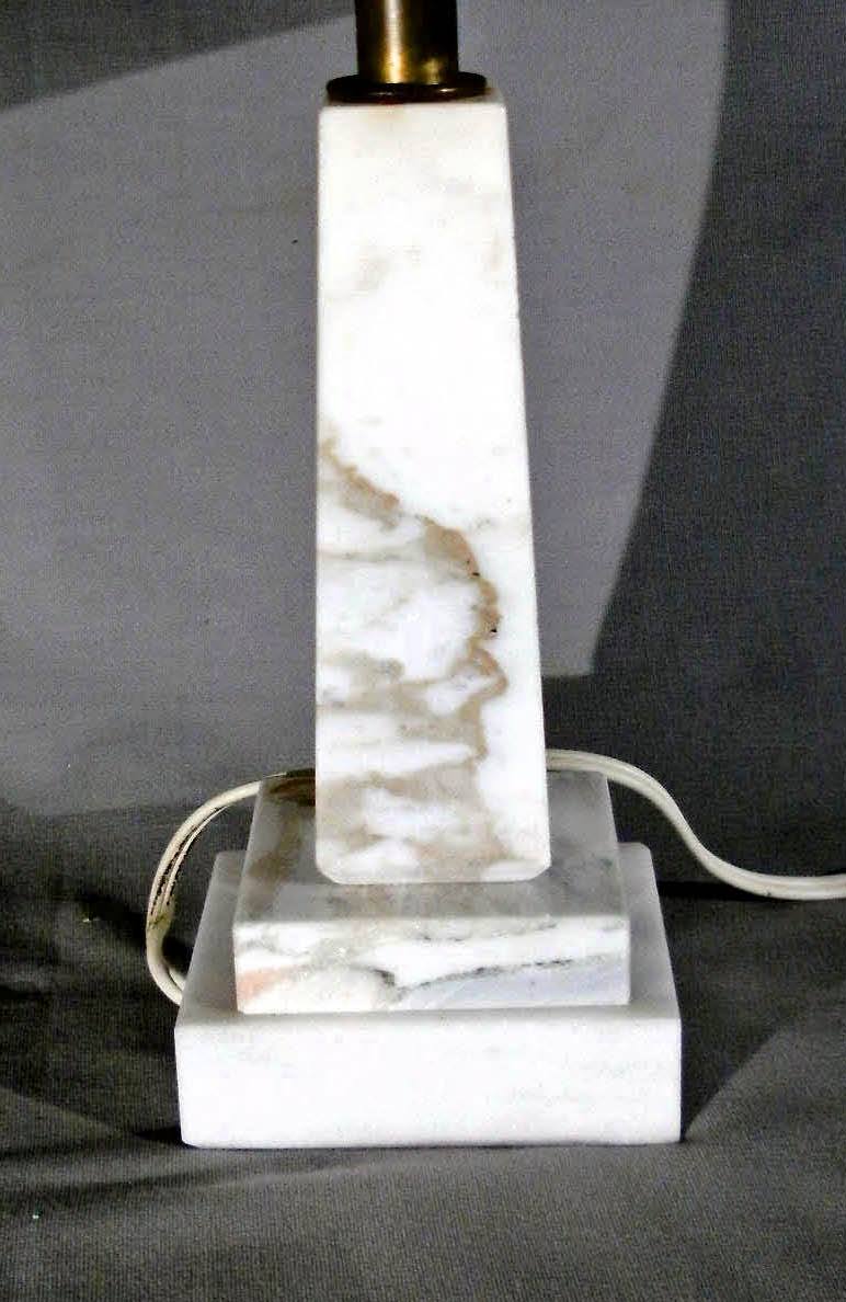 A Neoclassic obelisk form Italian striated while marble lamp on a squared, stepped marble plinth, electrified as a table lamp. Includes custom squared shape shade & brass ball finial. Obelisk dimensions: 9 1/2 H. Â